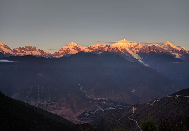 德钦之后是约11公里的爬坡到飞来寺,沿途可以多角度地欣赏梅里十三峰,前面的雪山与梅里雪山相比,根本不是一个档次。到飞来寺后,入住了守护6740客栈,标房70元无卫生间,不过窗外就是梅里雪山。不久之后,开始日落,有幸观赏到了著名的”日照金山“,真是美啊,其震撼程度让人无法形容……