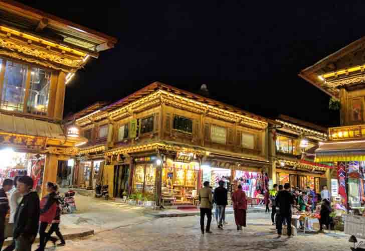 在独克宗古城附近入住了原素客栈,包早餐35元,老板娘是海口的,挺热情。出门吃过晚饭后,去藏式古城逛了逛,比起丽江古城,这里人要少多了。