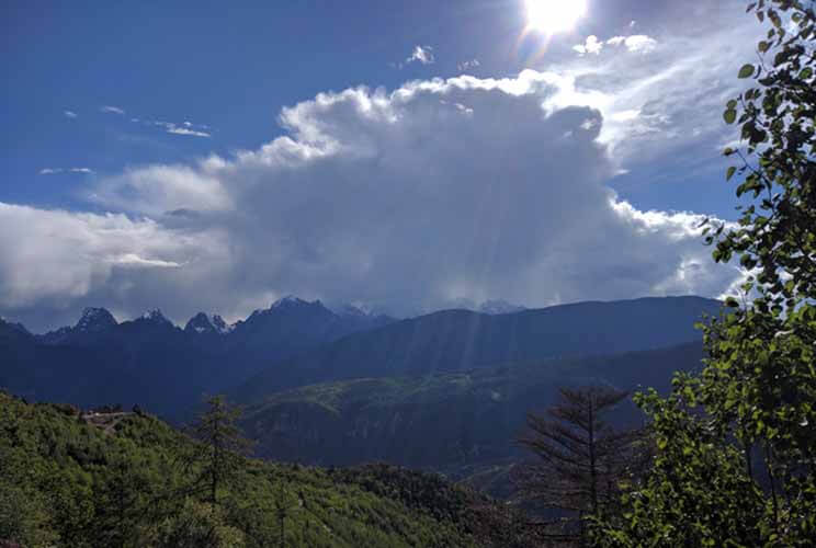 骑行了约77公里,难度一般★★★。从宝山村出来后,就是连续20公里左右的陡坡。今天的骑行难度不算太大,但还是晚上8点才到目的地,原因是在路上碰到一广西骑友,他拉肚子但是没带药,我给他药之后就一路结伴了。爬坡的过程中,他一路休息,我又爆了一次胎,因此耽误了不少时间。路上可以在观景台远眺哈巴雪山,不过正值酷暑,山顶没有多少雪。