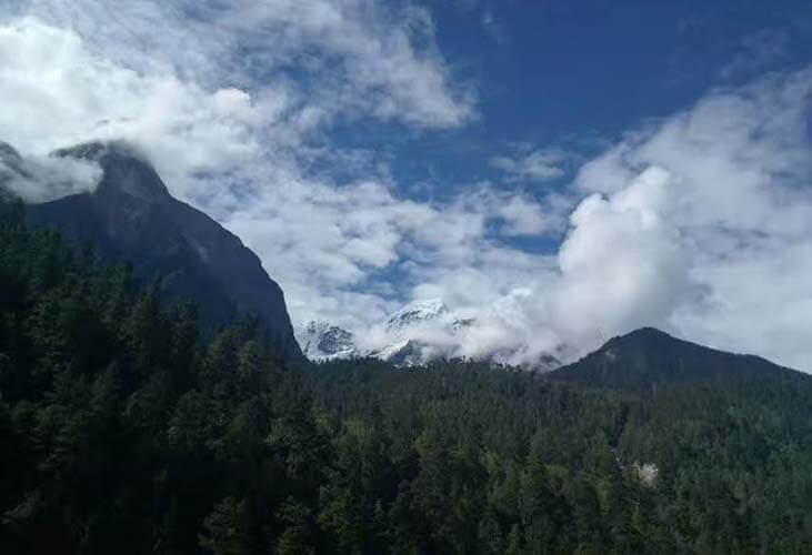 70多公里后出现了很多不知名的雪山群,虽没有梅里雪山那么壮观和震撼,但在各种森林、大山的掩映下,骑行中能够以不同角度地观赏,真是各有风味,千姿百态。